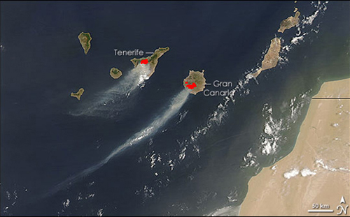 Smoke and fire product (polygons in red) over the Canary Islands in the Atlantic (namely Gran Canaria and Tenerife). A northeasterly flow over the Islands drags the smoke away from the fires. Note how there is a high contrast over sea and a low contrast over land, in particular in Tenerife.