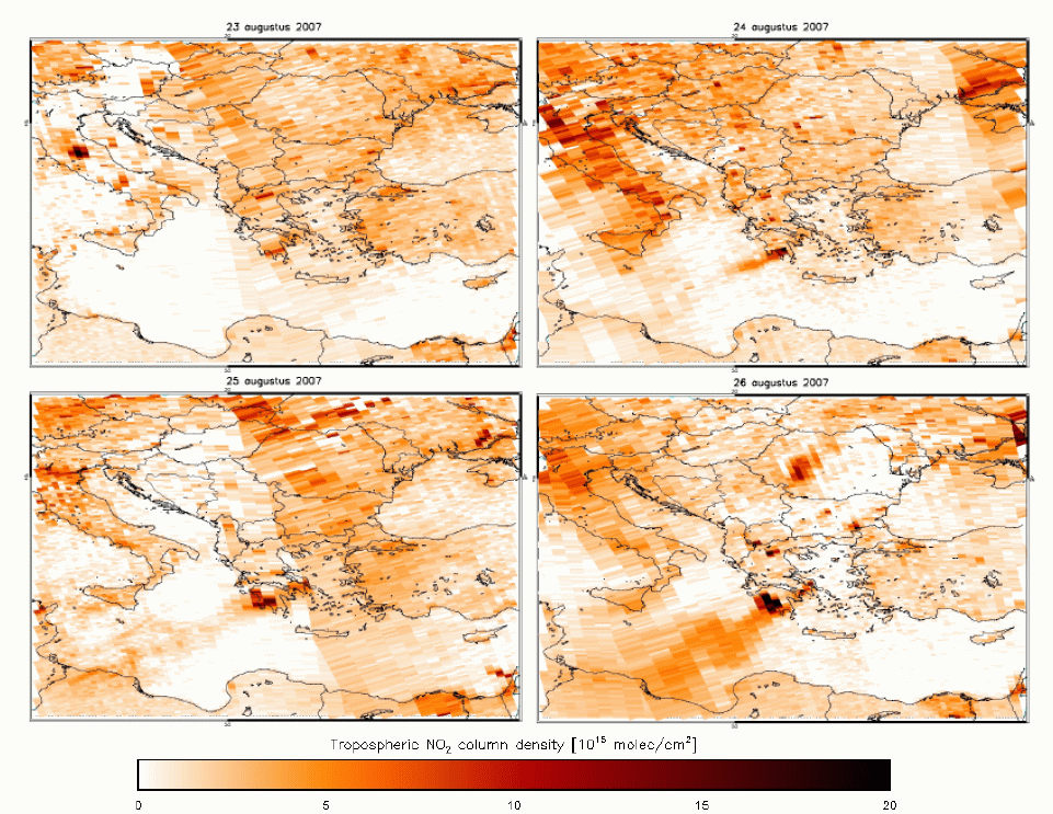 NO2 column density (in 1015 molecules/cm2) from the OMI (Ozone Monitoring Instrument) sensor onboard NASA's AURA-satellite from 23 to 26 August 2007 (during the forest fires in Greece). NO2 (together with formaldehyde) is a gas released by burning biomass and was detected over Greece and also downwind, even in the coast of Libya.