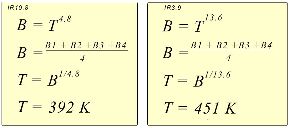 In this example over Portugal we have one MSG SEVIRI pixel which is divided into four sub-pixels. Among these sub-pixels we find a "hot spot" of 500 K. Using Rayleigh-Jeans law (5.1.3) we can then calculate the following brightness temperatures (BT) for the MSG SEVIRI pixel for the IR10.8 and IR3.9 channels.