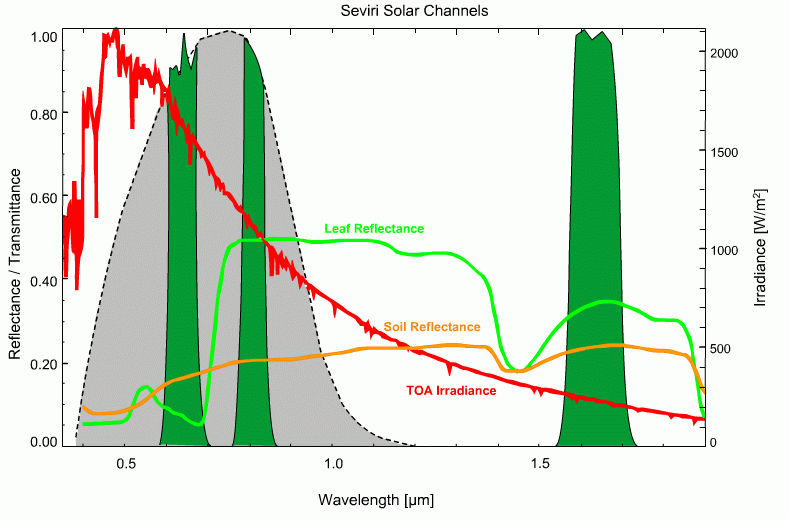 First you should be aware that the channels best suited for aerosol detection are those with wavelengths smaller than 0.7 μm (700 nm), because there is less reflectance from the surface (forest, types of soil, ...) to interfere in the detection. You can check this property in Figure 5.22, which shows the difference of soil reflectance and (mainly) leaf reflectance between the two SEVIRI visible narrow bands (0.6 μm and 0.8 μm).