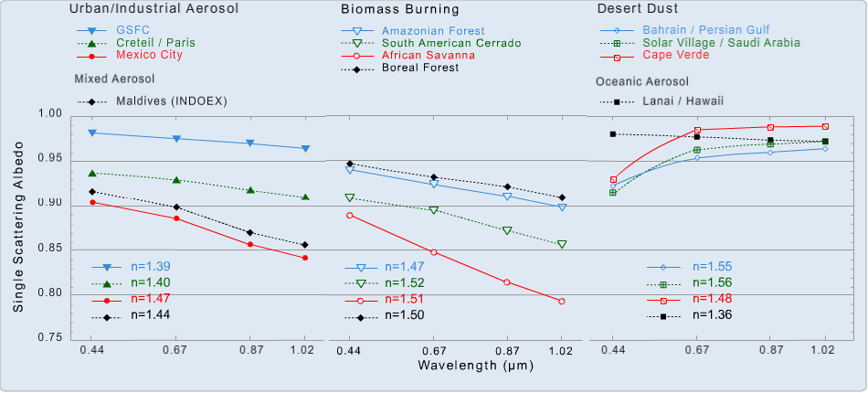 In fact, the absorption of radiation by biomass burning aerosols is higher than for other aerosols, such as desert dust or oceanic aerosols. This fact is confirmed in Figure 5.24, where single scattering albedo (ratio of scattering to scattering plus absorption) is shown for different kinds of aerosol; urban/industrial, biomass burning, desert dust and oceanic aerosol. The lower the single scattering albedo, the higher the absorption!