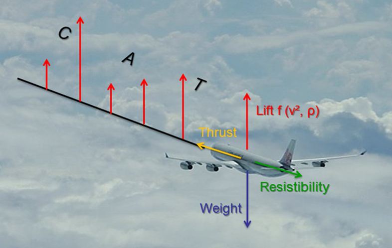 When the aircraft is flying with a constant speed and a constant height, all fources are in balance. The amount of lift and weight are equal. The same applies to trust and resistibility. The lift force is a function from the tip velocity of the air (v2) and the air density (ρ).
