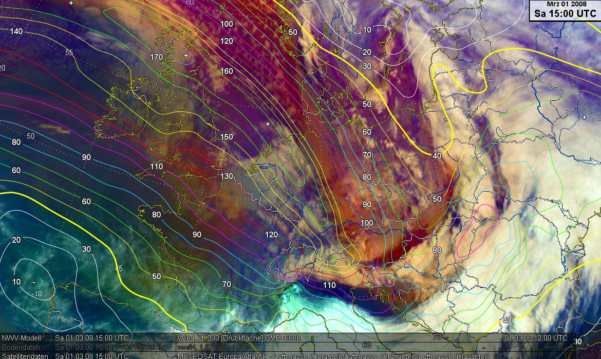 Fig. 3.4: 1 March 2008, 15:00 UTC. 300 hPa isotachs in kt, Airmass RGB