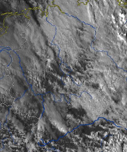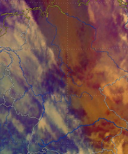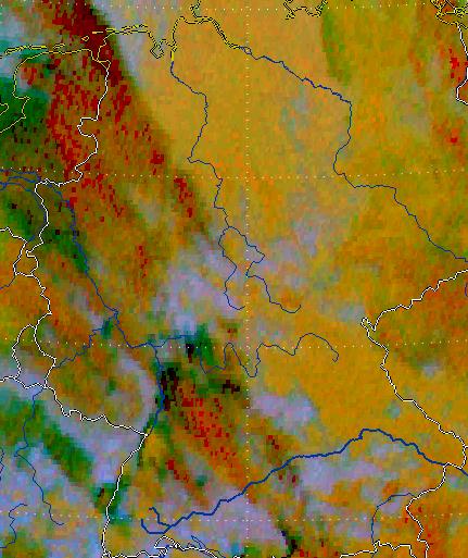 The images in Fig. 3.5 – 3.8 show sections of 15 UTC RGB's over Germany. There are jet fibres parallel to the jet axis. The white color in the Airmass RGB hints at high clouds. The HRV RGB and the HRV shows clearly the shadows of lower clouds over eastern parts of Germany.