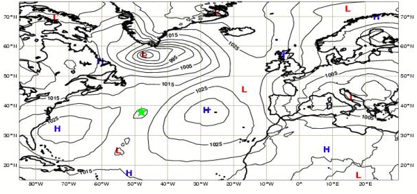 The swell that developed south of Iceland between 16 and 17 April was therefore the result of a steady and strong southwesterly (and, later, northwesterly) flow at the surface, which was initiated on 14 April 2012. Several weak and continuous surface perturbations associated with upper level disturbances generated cyclones east of Newfoundland, which then moved towards Iceland and the British Isles. Over the Azores, a blocking high prevented the cyclones from heading that way. The block persisted in the sub-tropical latitudes of the North Atlantic Basin for over a week. Despite the continuous cyclogenesis over this period, one frontal wave played a particularly important role. At 00:00 UTC on 15 April, this shallow surface low was centered on 39ºN, -48ºE, halfway between the Azores and Newfoundland (Fig. 4).