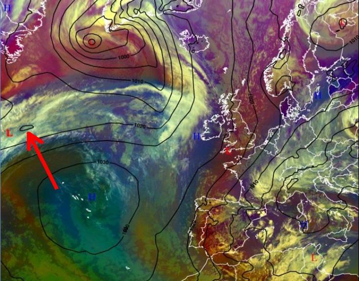 Fig.4. Mean sea level pressure prognosis (hPa) from the ECMWF model for 15/04/2012 - 00:00 UTC (the red arrow identifies the surface low). MSG Airmass RGB at 12:00 UTC on 15/04/2012.