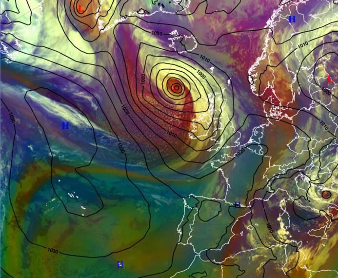 Fig.5. MSLP prognosis (hPa) from the ECMWF model for 17/04/2012 - 00:00 UTC. MSG Airmass RGB at 00:00 UTC on 17/04/2012.