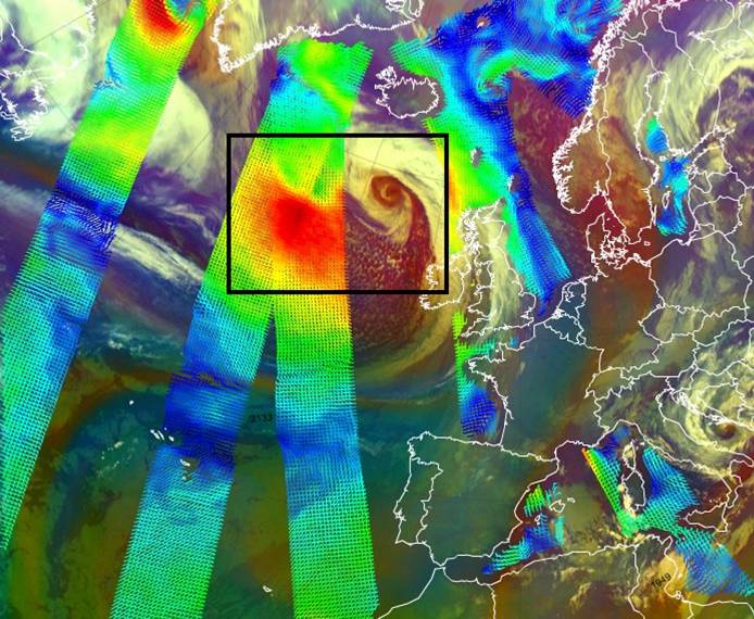 Fig.7. ASCAT wind (color wind barbs) between 21:00 UTC and 23:30 UTC on 16/04/2012. MSG Airmass RGB at 00:00 UTC on 17/04/2012. The black rectangle represents the zoom area (*click on the image to see it).