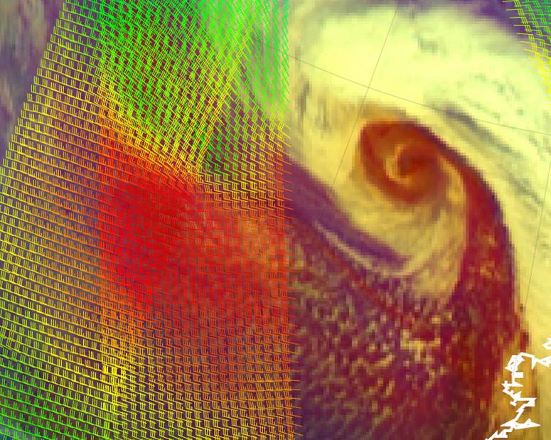 Fig. 7 reports an ASCAT overpass in our region of interest and gives wind speed in the southwest quadrant of the low, which was the most important one for the storm. The image shows a fraction of 2 ASCAT swaths acquired on late 16 April (21:00 – 21:30 UTC and 23:00 – 23:30 UTC). This data reveals gale winds (30 kt) over a large area and up to 45 kt in a small region. High wind speeds were also registered from drift buoys and ships along the depression’s track.