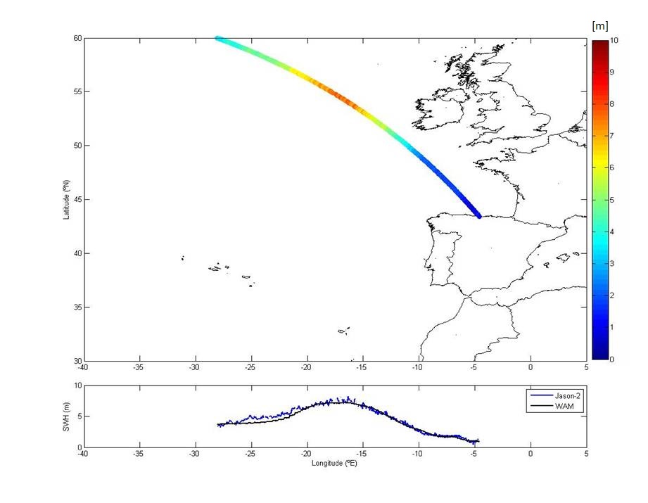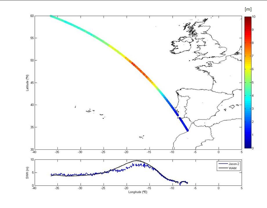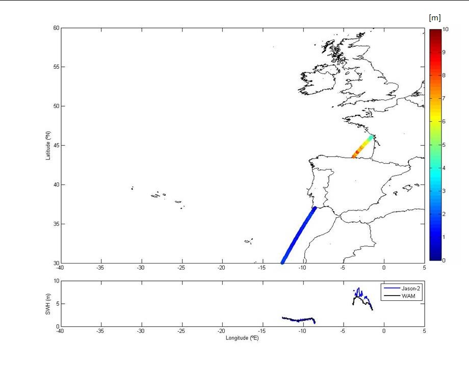 Fig. 9 shows that highest SWH values are obtained in a large region (approximately with 5º x 5º) centered on 53ºN, -18ºE. In this area, Jason-2 observations reveal SWH values between 7 and 8 m, and these are consistent with the WAM estimations. Lower SWH estimates (less than 3 m) were observed to the south of Ireland and over the Bay of Biscay.