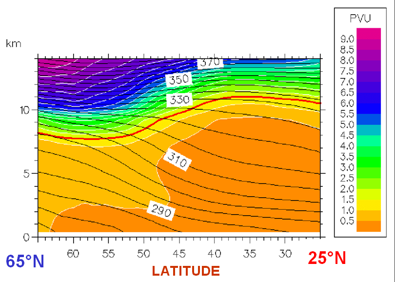Figure 2: Vertical cross section of the troposphere. The black isolines depict equivalent potential temperature, while the different colors represent PV. The red line marks the PV=1.5 PVU surface (the dynamical tropopause).
