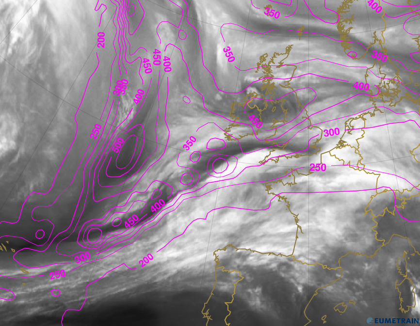 Figure 1: WV 6.2 µm channel from 1 February 2013 at 06:00 UTC. The magenta isolines depict the height of the PV=1.5 PVU surface in pressure coordinates [hPa].