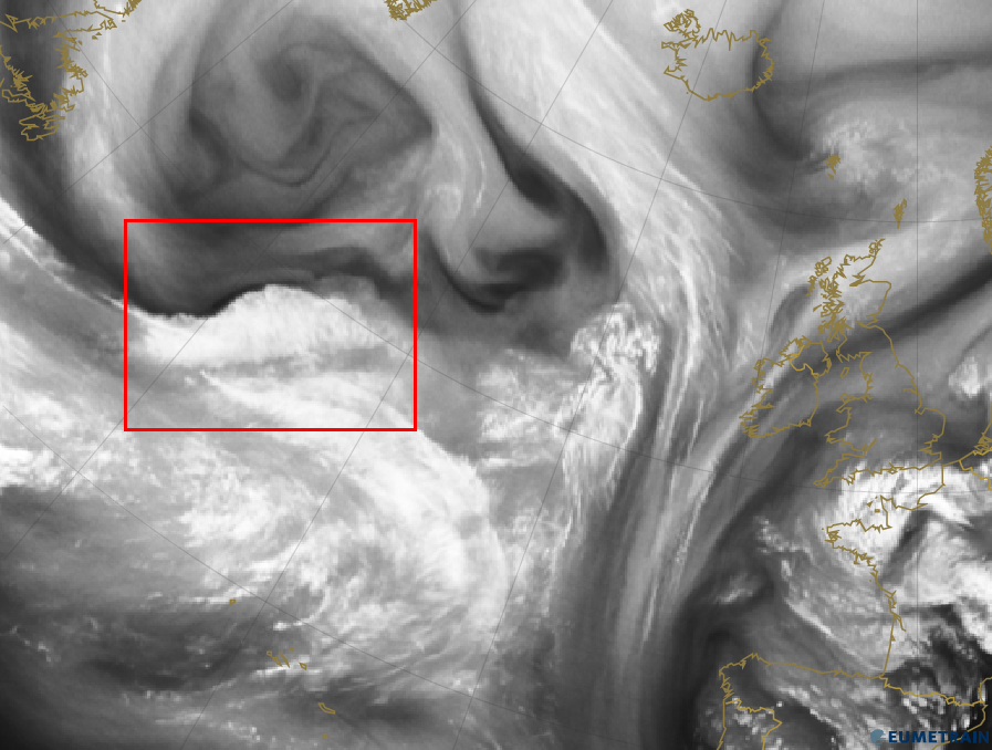 Figure 1a: WV 6.2 µm image from 20 May 2012, 12:00 UTC – a baroclinic leaf (red square) develops over the Atlantic.