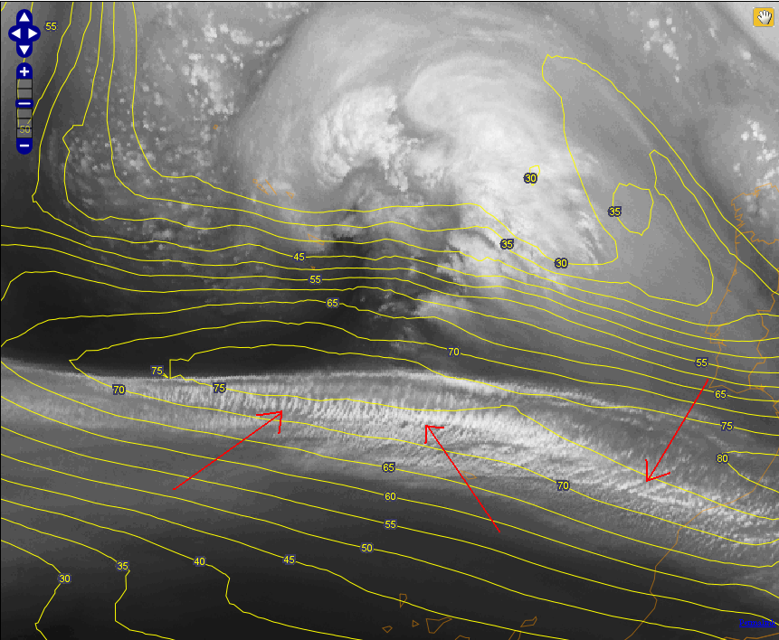 In satellite images, these transverse cloud bands have a similar appearance to lee waves at the lee of mountain ranges, but while the first can be detected in the WV channels, the latter usually cannot be seen in WV images as they are located in lower tropospheric regions.