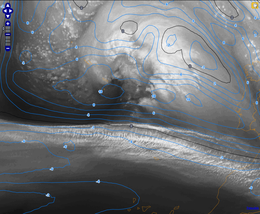Figure 1a and 1b: Transverse cloud bands (red arrow) within a cirrus cloud band over the Atlantic in WV 6.2 µm imagery. Left image with isotachs at 300 hPa, right image with shear vorticity at the same level.