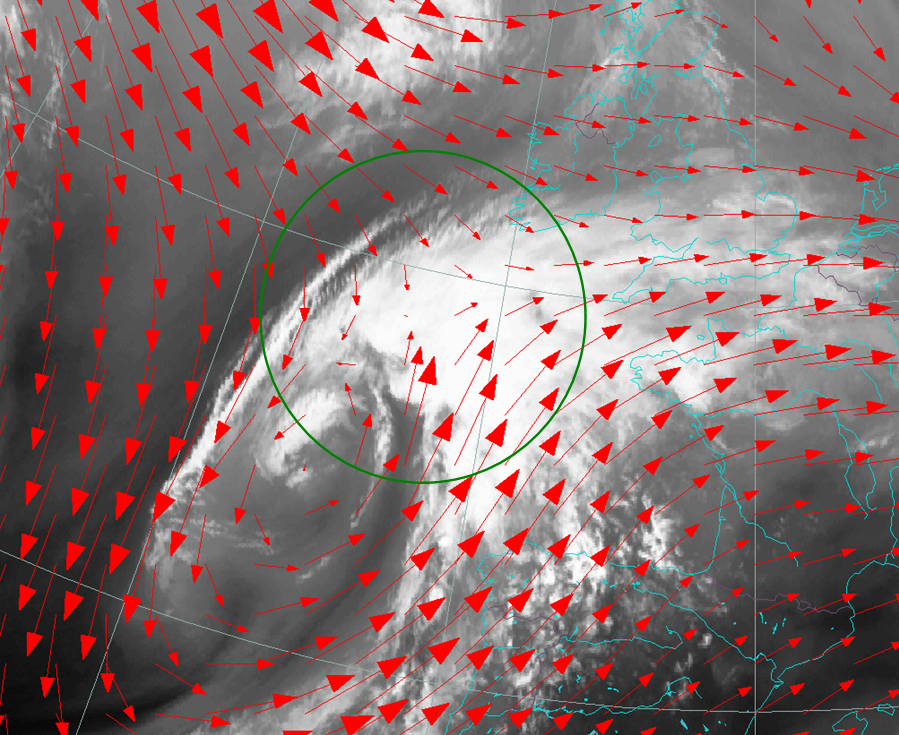Figure 2: WV 6.2 µm satellite image from 12 September 2012 at 18:00 UTC. The red arrows indicate wind direction at 500 hPa, and the green circle shows the deformation zone at the occlusion point of the frontal system.
