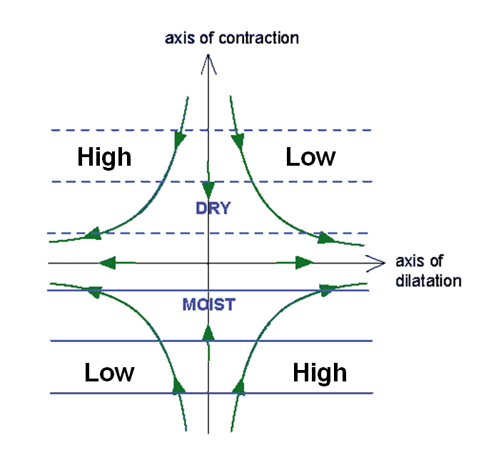Figure 1: Schematic showing a deformation zone. The green arrows indicate the direction of the air stream around high and low pressure zones.