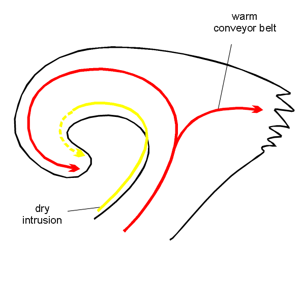 In this transition zone we also find the splitting of the warm conveyor belt (WCB) into two branches as indicated in figure 3. In mature low pressure systems, the WCB carries moist air from the warm sector ahead of the cold front line towards the occlusion point of the system. At the occlusion point, one branch of the warm conveyor belt turns left along the occluded front, while the other branch is directed along the warm front. As the WCB is continuously rising along its path, the splitting occurs in upper levels of the troposphere, in the vicinity of the jet streak. The sudden change in the direction of the WCB, together with strong wind shear in the vicinity of the jet are factors that favor the occurrence of turbulence.