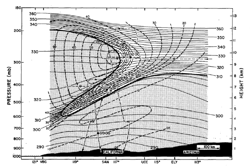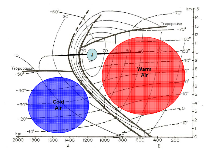 When tropopause folding occurs, a tongue of dry stratospheric air propagates into the air mass boundary underneath the core of the jet stream by ageostrophic forcing (figure 6). This tongue of stratospheric air is delineated by a clear gradient in potential vorticity at its boundaries.