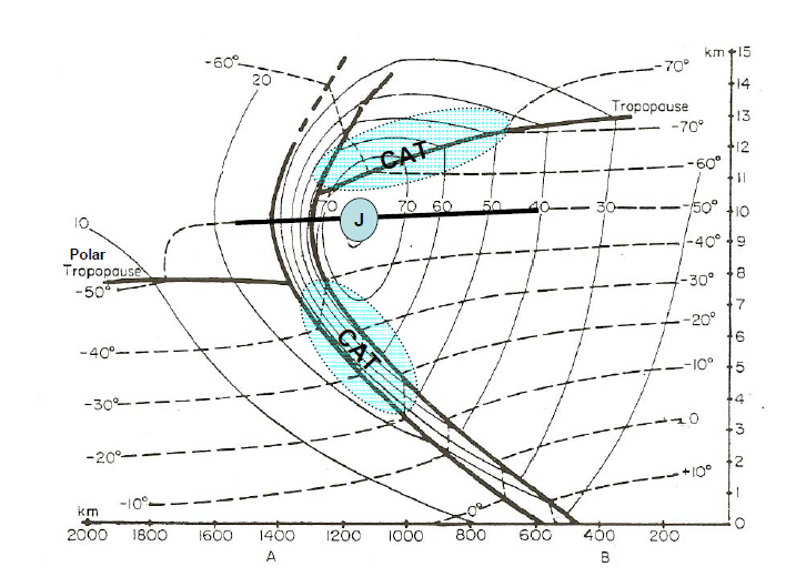 Figure 7: Vertical cross section through a cold front showing the areas prone to turbulence in the vicinity of the jet axis (from Chr. T. Kuhl, 2006).