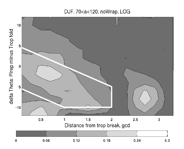 Figure 8: Frequency of light or greater turbulence from eddy dissipation reports near tropopause folds (Dec. 2004 to Feb. 2005) from Wimmers and Feltz, 2010.(1 gcd ~ 111 km). The tongue of stratospheric air is depicted by the white line.