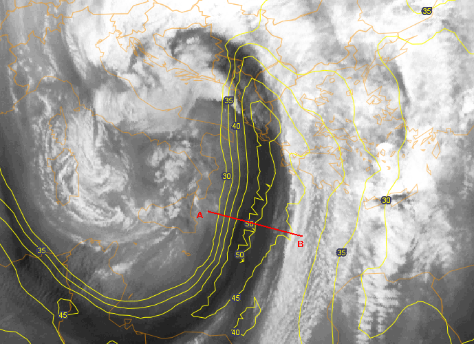 Figure 5a and 5b: The left image shows the approximate position of the vertical cross section and the isolines of the jet on the WV 6.2 µm image. The right image shows a vertical cross section (from Christopher T. Kuhl, 2006) with the lower tropopause on the cold side of the front, the higher tropopause on the warm side and the tropopause fold in between.