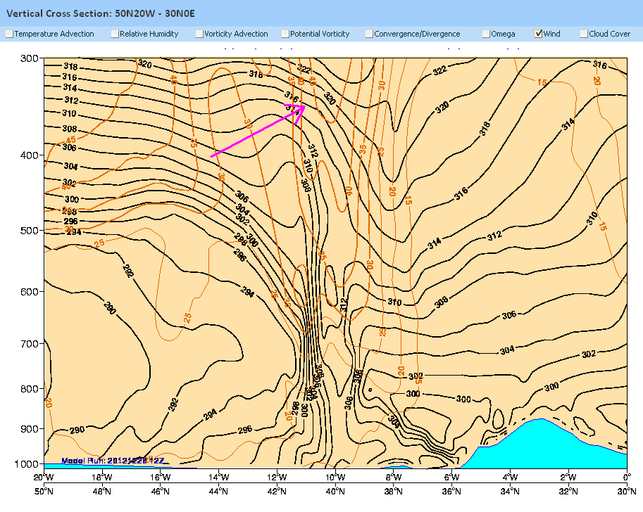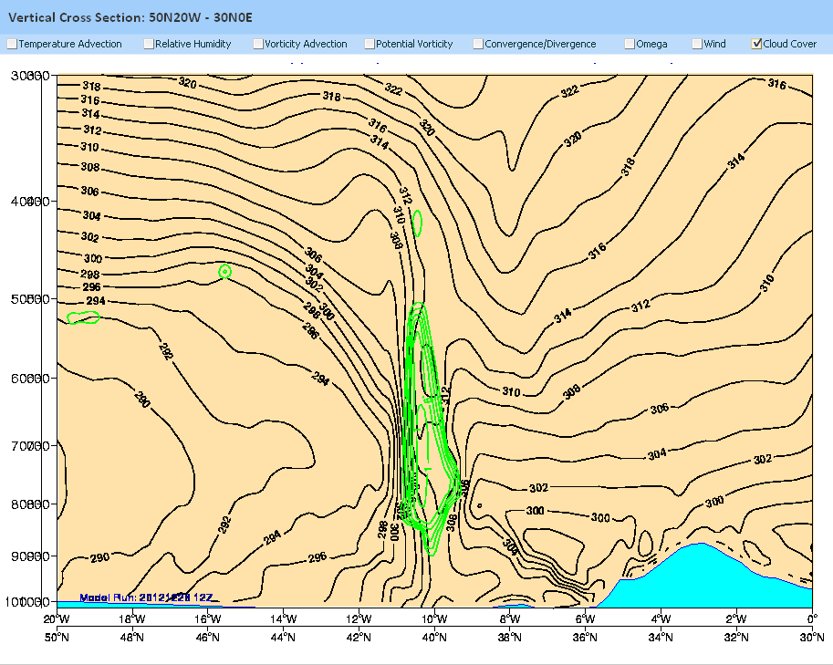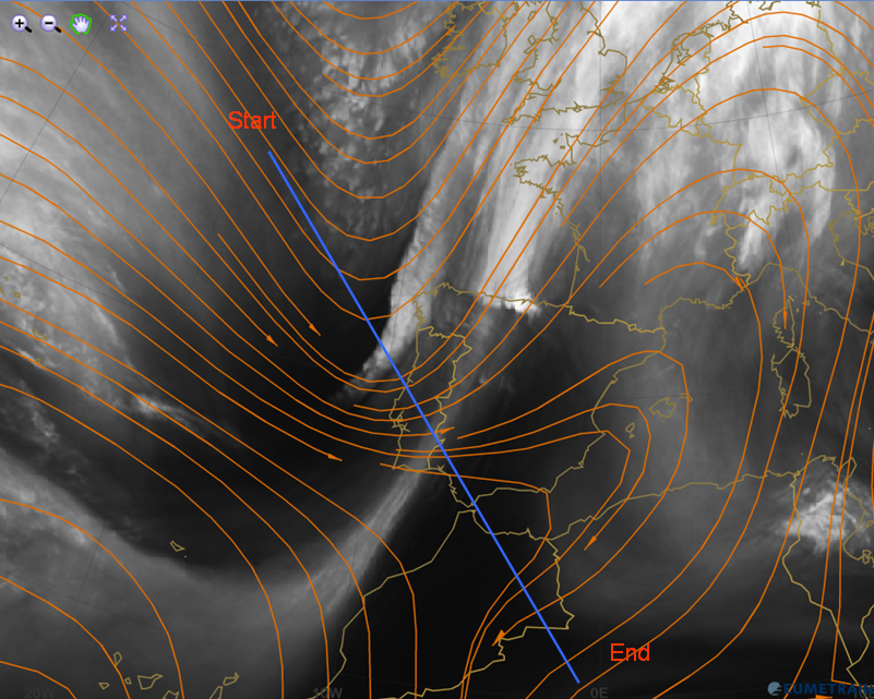 To better understand the underlying physical processes, we will discuss vertical cross sections (VCS) of the frontal cloud band west of the Moroccan coast. While the deformation zone over southeast Europe is a transition zone between a warm front and an occlusion, as shown in the first example (figure 2), the deformation zone next to Gibraltar has a different origin.