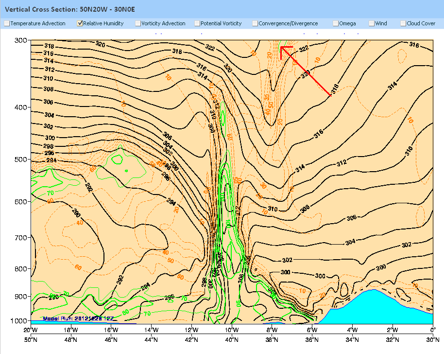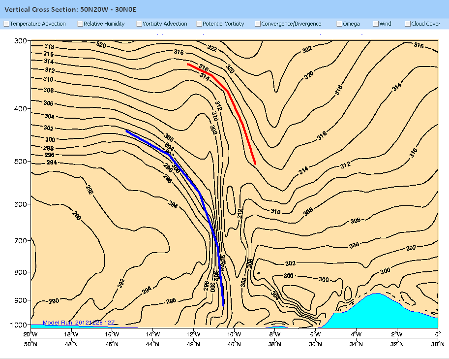 Figure a) shows the isolines of the equivalent potential temperature. A steep cold front reaches from 400 hPa down to the surface (41N and 11W). The cold front (blue line) is moving in an easterly direction. An upper level cold front (red line) can be seen ahead of the cold front and above 500 hPa.