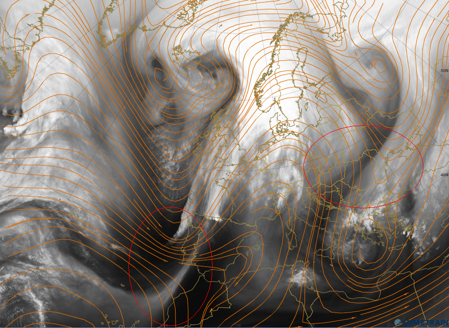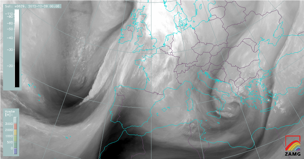 On December 29 2012, two deformation zones can be observed in WV images over Europe. These deformation zones are not visible in IR imagery, but can be clearly seen in the WV loop.
