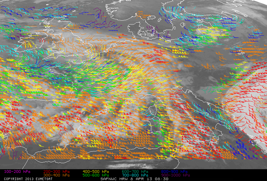 Figure 2: SAFNWC/MSG HRW AMVs for an area covering most of Europe and the Mediterranean: 08 April 2013 08:30 UTC (source: http://www.nwcsaf.org/)