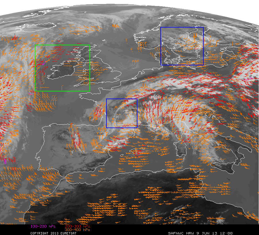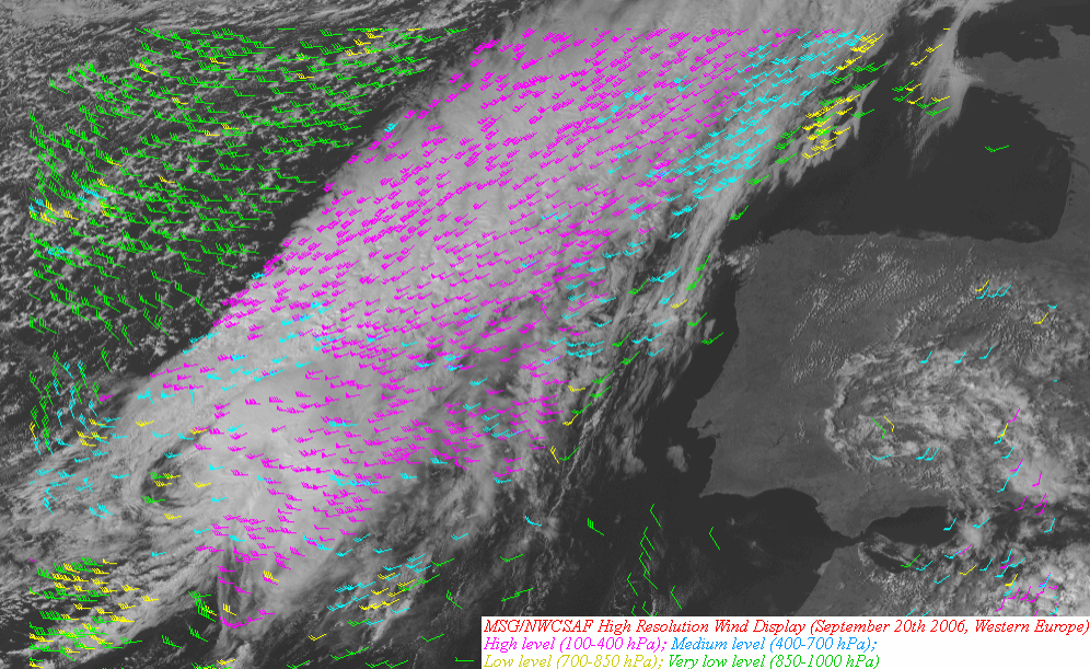 In September 2006 Hurricane “Gordon” first affected the Azores Islands as a hurricane and a few days later hit the north-western parts of the Iberian Peninsula as a tropical storm. In figure 3 the AMV analysis and the corresponding HRVIS satellite image of this date can be seen. The tropical storm is located in the south-western corner of the image connected to the southern end of a cold front. The surface low associated to Gordon can be detected quite clearly from the satellite image, but as the cyclone is completely embedded in the general flow of the cold front only a slight cyclonic deviation of the flow can be seen together with strong winds in lower layers.