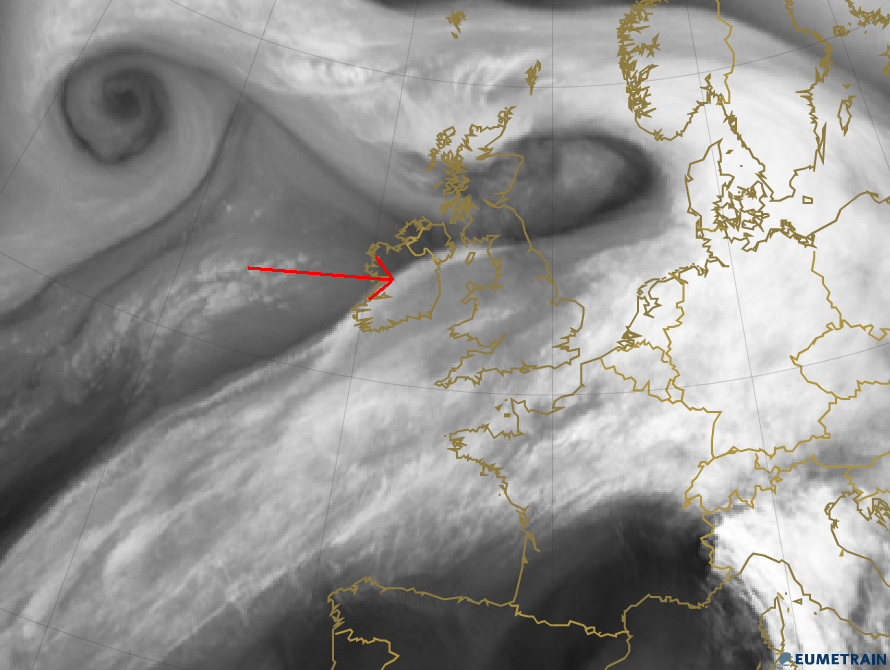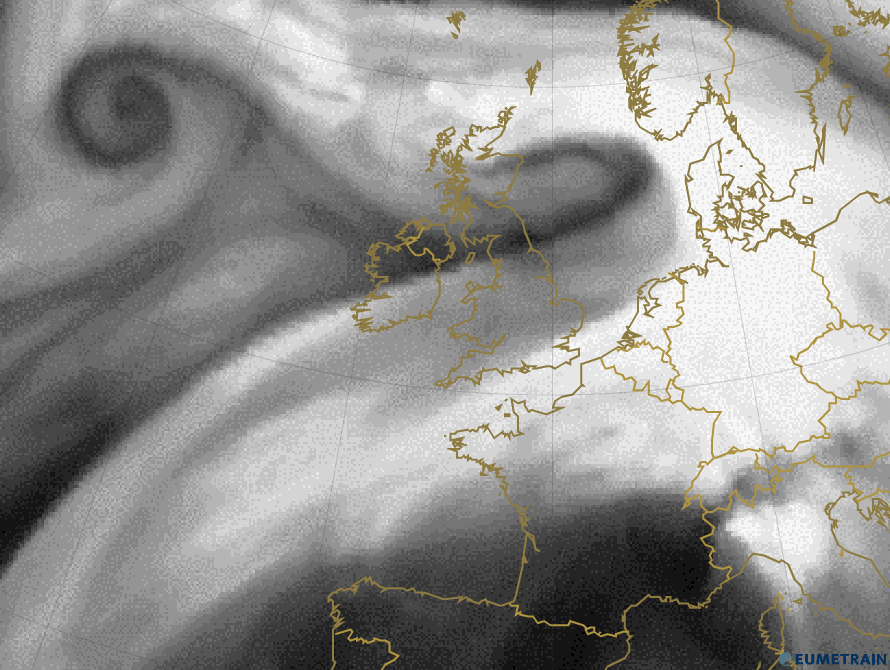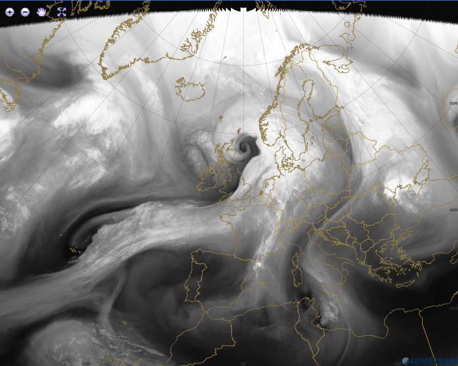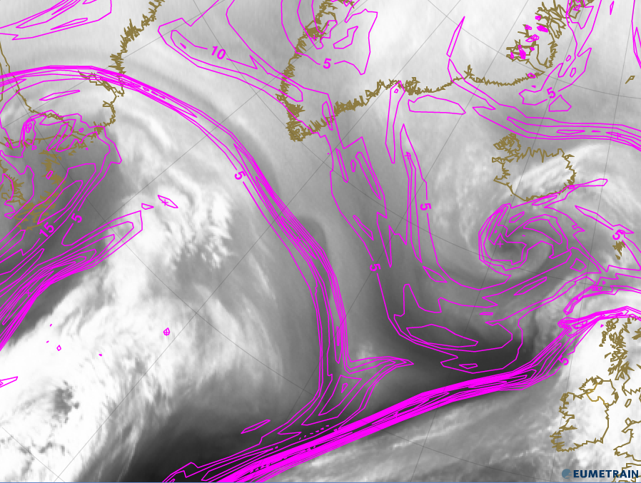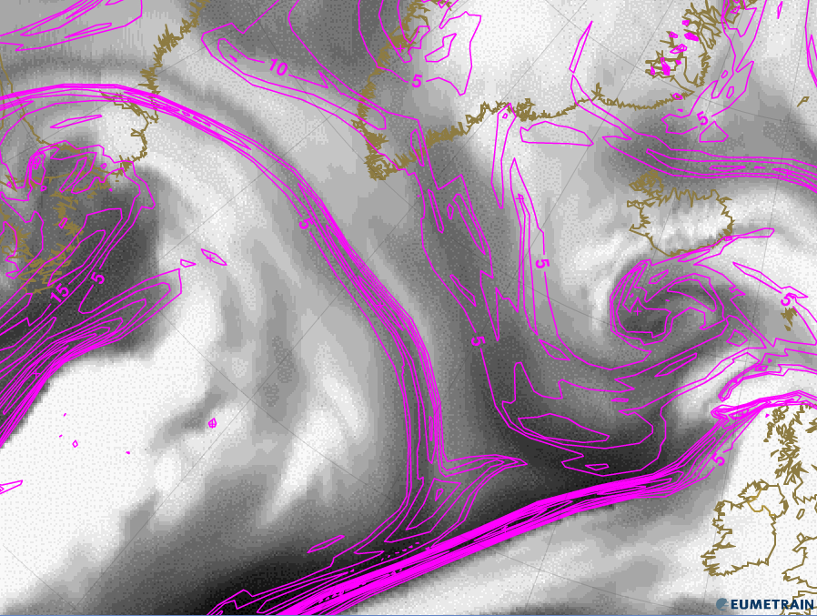 The above example clearly shows the shortcomings of prognostic model fields for frontal substructures compared to the real situation. While the large scale atmospheric currents are well reflected in ECMWF model fields, differences between forecast and actual data become visible in smaller scale features when comparing simulated against real satellite data. Comparing the two data sources in the same format allows a rapid cross-checking of the model’s coherence with observed data.