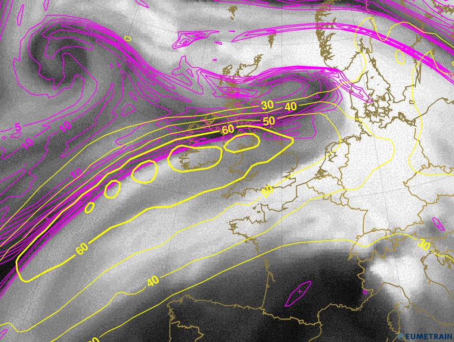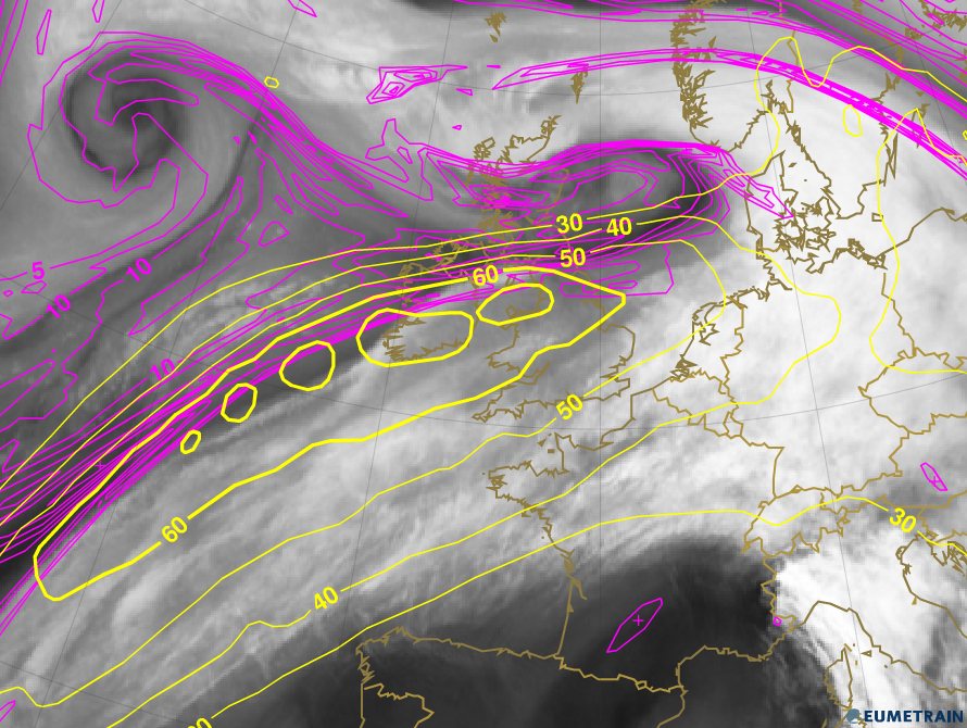 c) Real WV 6.2 µm image with positive vorticity and isotachs at 300 hPa