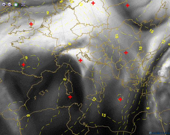 Figure 7a and 7b show a comma-like structure formed in the lee of the Alps. Although this comma lies within an anticyclonic ridge in the model, the development of the high cloud structures seen in both IR and WV images indicates cyclogenesis on the lee side of the mountains. Model fields at 18:00 UTC do not resolve this process in its whole extent, just showing some lee cloudiness south of the Alpine crest.