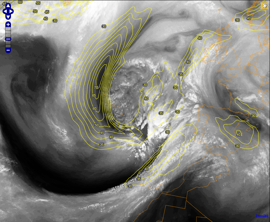 Figure 6: WV 6.2 µm image from 22 October 2012 at 12:00 UTC. The yellow isolines depict the isotachs [m/s] of the jet at 300 hPa.