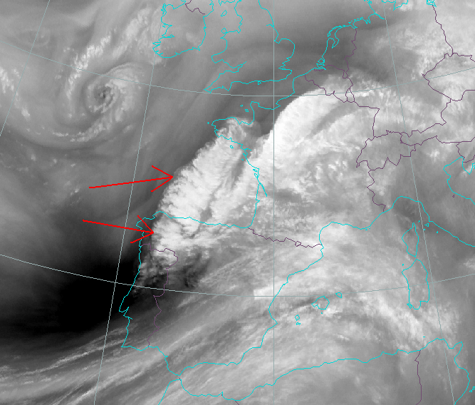 Figure 5: MSG WV 6.2 µm satellite image from 11 April 2013 at 10:30 UTC. The red arrows show the scallop pattern over Spain and the Bay of Biscay.