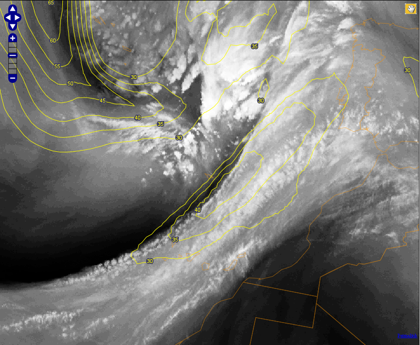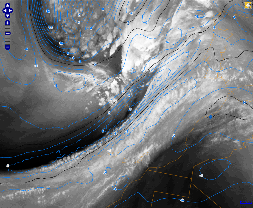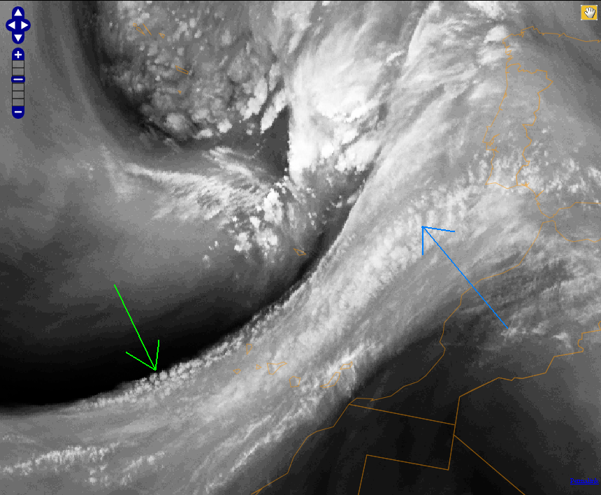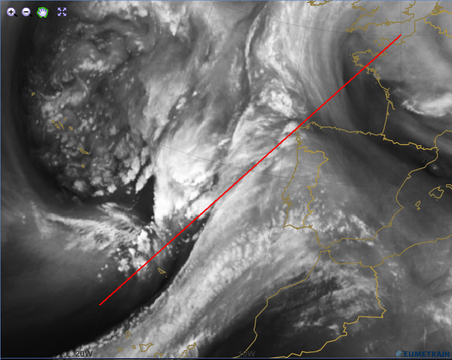 The WV image from 22 October 2012, 12:00 UTC (figure 6) shows a branch of the polar jet stream over the Atlantic heading towards the southeast and a branch of the subtropical jet west of Morocco and Portugal heading towards the northeast. A dark stripe in the WV 6.2 µm image is clearly visible on the cold side of the jet axis for both jet streaks. The moisture gradient zone corresponds to the axis of the jet.
