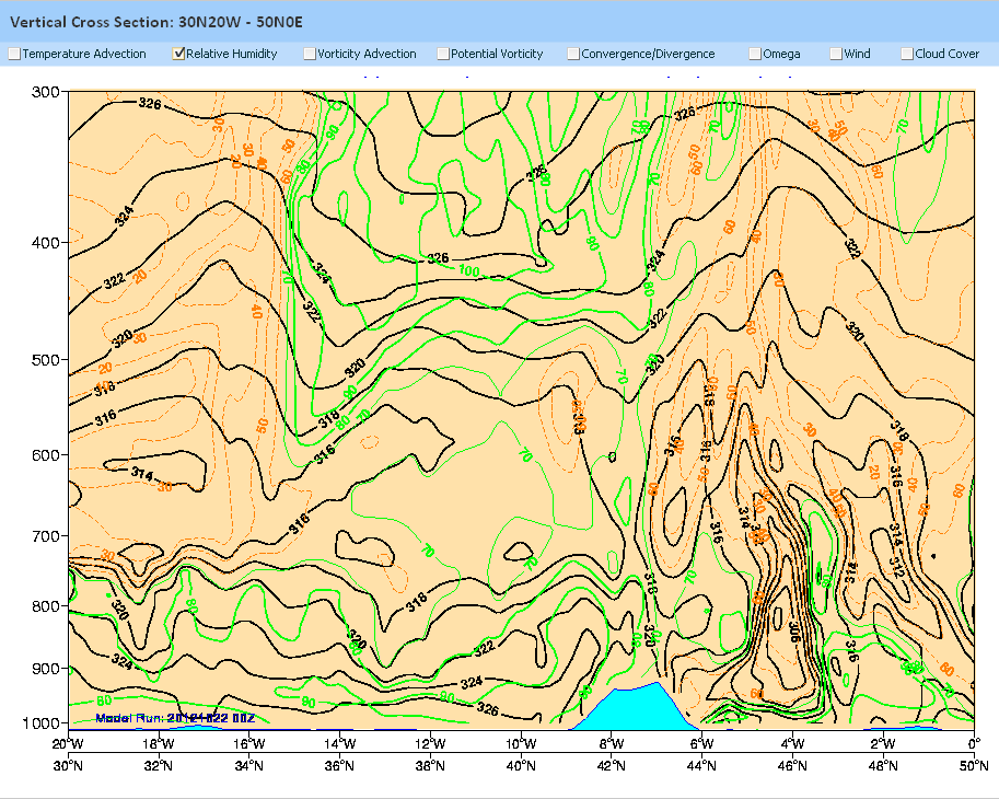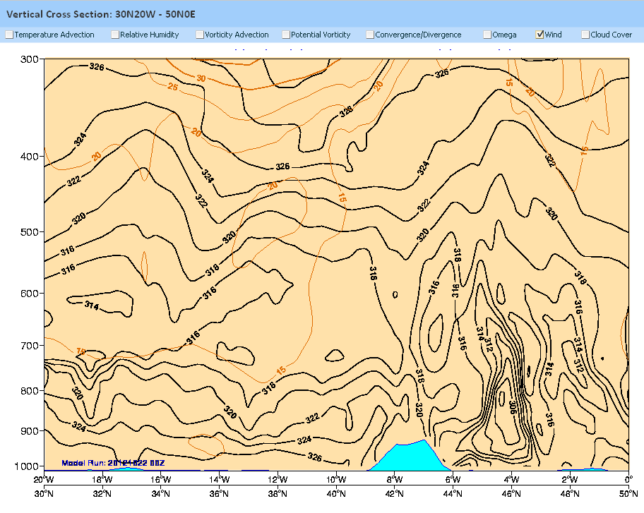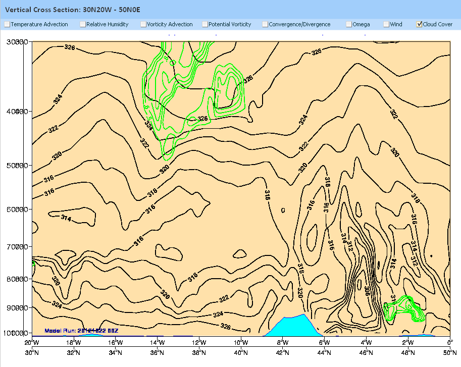 The isolines of the equivalent potential temperature in figure 8b-8c show the position of the upper level front between 16W/34N and 14W/36N. The cloud cover visible in satellite imagery is reflected in the model fields as well as the high values of relative humidity as a precondition for condensation. The isotachs suggest strong vertical wind shear.