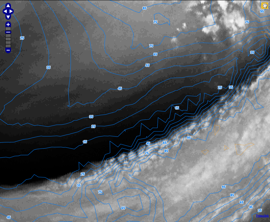 This environment is favorable for Kelvin-Helmholtz waves to become visible in IR images, and in WV images they are even clearer. While descending air masses in the wave trough tend to warm up and evaporate cloud droplets/ice crystals, the moisture in the air condenses at wave crests. High values of relative humidity are necessary for the wave pattern to show up in satellite imagery.