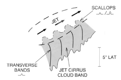 Figure 4: Schematic showing the relative position of turbulence to transverse bands and scallops in a jet cirrus cloud band. Dashed lines enclose regions where moderate turbulence is likely.