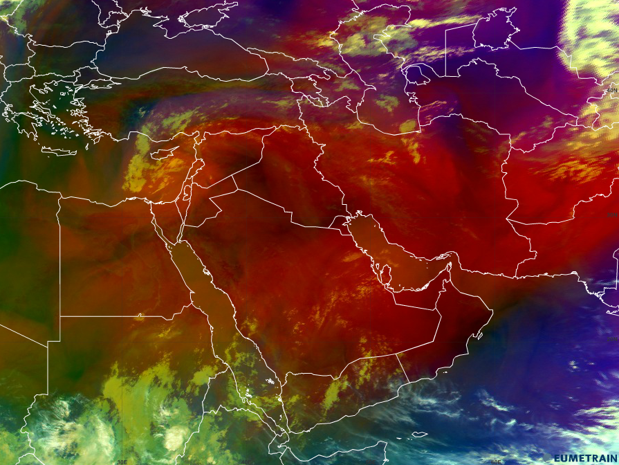 Figure 11a shows a summertime Air Mass RGB image of the Middle East, where red colours are dominating the image. In this image the red to dark red colours indicate very high surface temperatures and low upper tropospheric humidity. A hint to discern dynamic tropopause anomalies from hot and dry areas: If the Air Mass RGB shows red colours because of high surface temperatures, those areas naturally only occur over land. For comparison one can look at the WV 6.2 µm image of the same date (figure 11b); no significant dark stripes can be seen there.