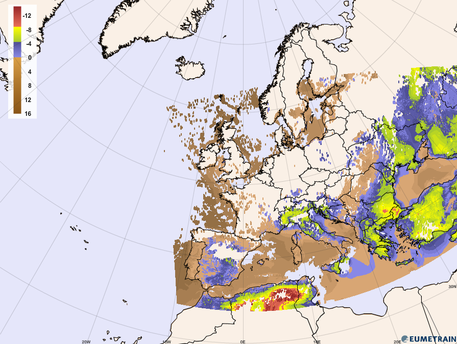 The brightness temperature difference of the two IR channels on the green beam depicts an estimation of the tropopause height based on ozone concentration. A positive temperature difference is a sign of a high tropopause and tropical air mass.