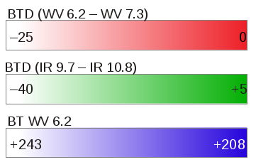 - GREEN = Brightness temperature difference (IR9.7 – IR10.8)