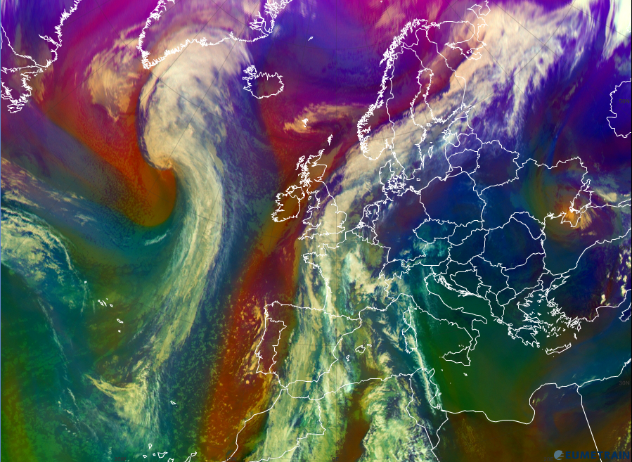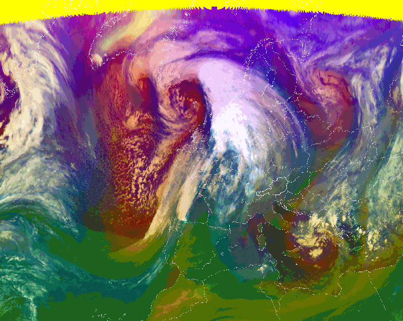 Air Mass RGBs can help detect areas of high PV advection (and therefore jet streaks and developing rapid cyclogenesis). The so-called stratospheric intrusions, where dry and ozone-rich air protrudes down into the troposphere, are shown in red to orange colors in the Air Mass RGB. They indicate zones of high PV advection.