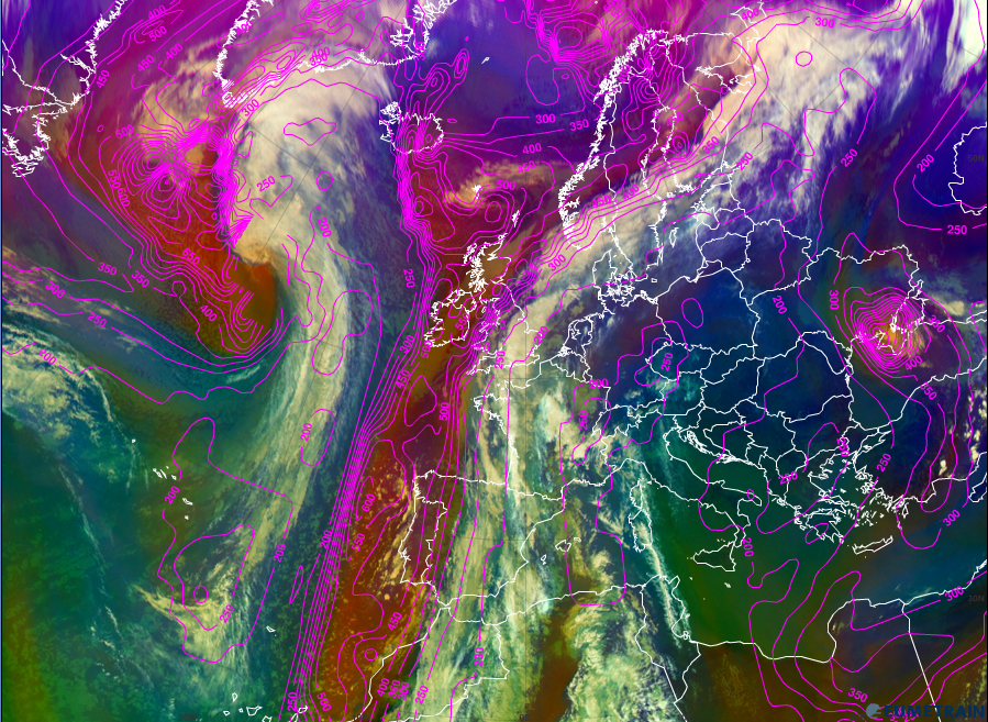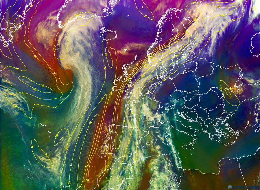 Figure 8: Air Mass RGB and ECMWF model field of the 300 hPa isotachs (yellow), 19 October 2012, 12:00 UTC.