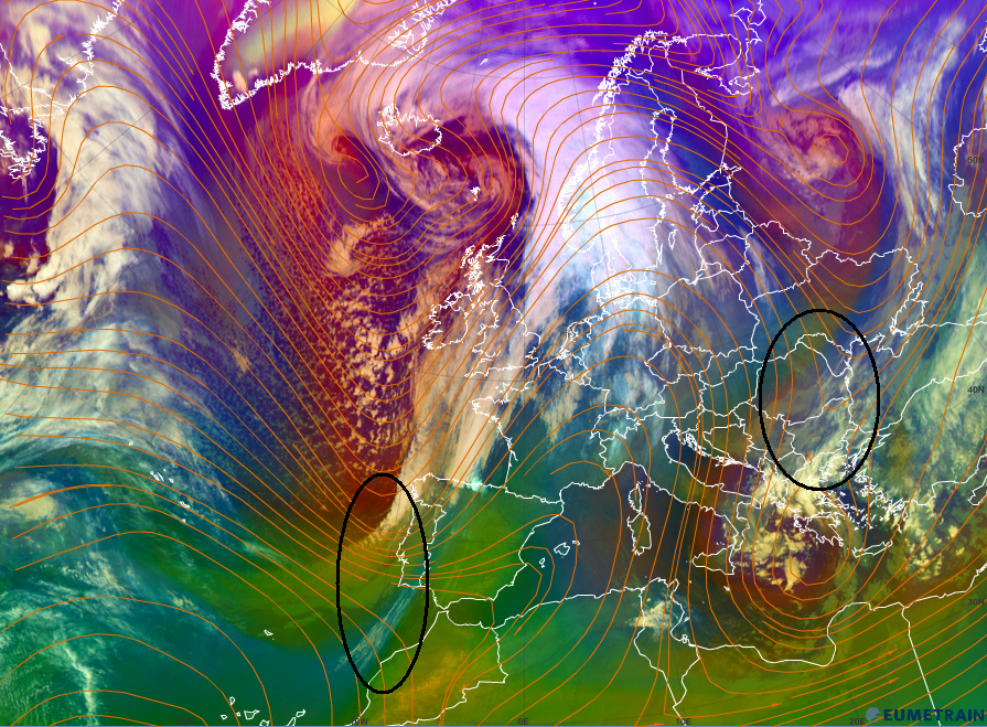Figure 9: Air Mass RGB overlaid with the ECMWF model field of the 300 hPa streamlines, 29 December 2012, 06:00 UTC. The black circles mark the deformation zones.
