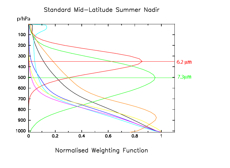 In the following image there are the weighting functions that show the relative vertical contribution of radiation emitted by atmospheric substances in different IR channels. The two water vapour bands dominate the upper and middle troposphere.