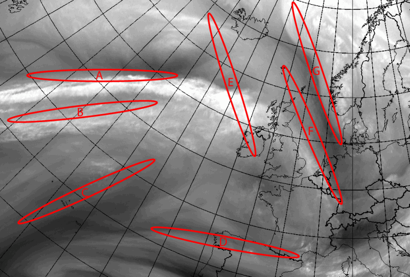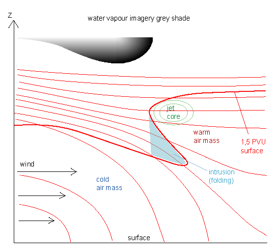 "Tropopause folding" occurs when the stable stratospheric air intrudes under tropospheric air under the jet stream. It can be seen as a sharp gradient in the grey shades of water vapour images.