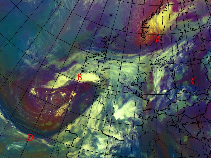 Recall chapter 2 and find the right locations for the following four humidity profiles in the Airmass RGB image below. Choose a vertical profile and click on the correct place in the map. Click on the links to see a full-size version!