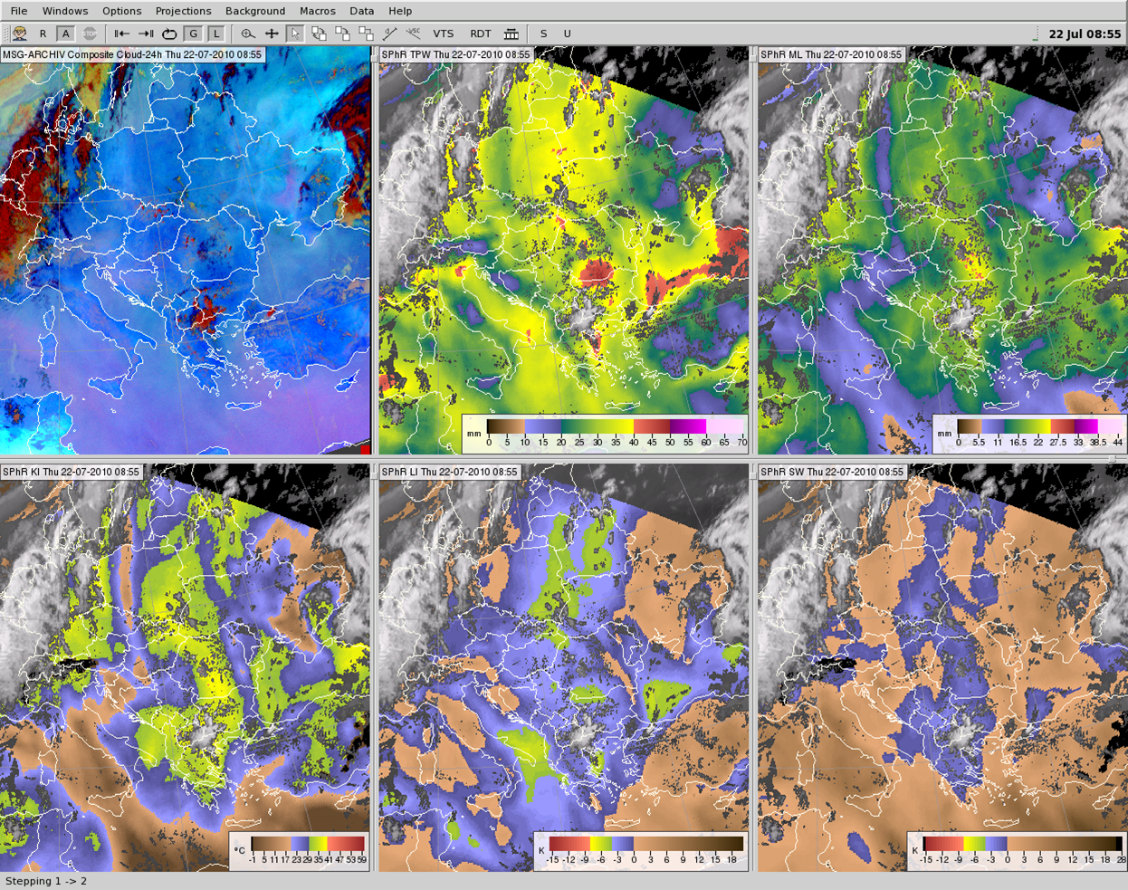 The following figures show the 24 hour Microphysics RGB image and SPhR products for 22 July 2010, 2:55, 5:55 and 8:55 UTC.